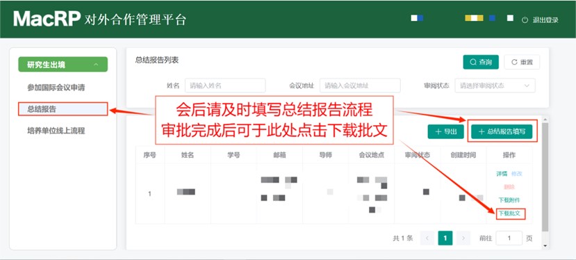 审批完成后,系统将在申请人首次登录MacRP时弹出审批完成提示。学生可在“总结报告列表”中点击“下载批文”,获取带有审批印章及文号的正式电子批文。