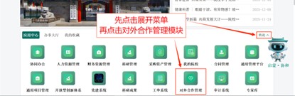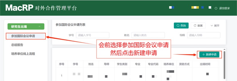 学生可通过本人账号登录MacRP(电脑端),地址为:https://macrp.pumc.edu.cn/portal/index.html#/login。登录后,请在“应用中心”下拉展开选择“对外合作管理”应用模块,进入相关流程。