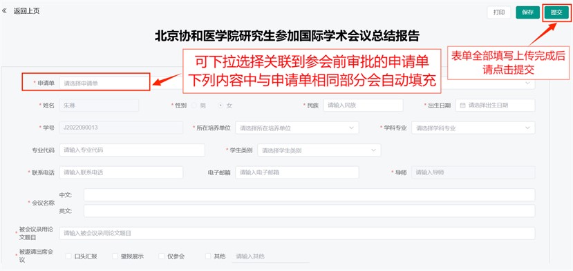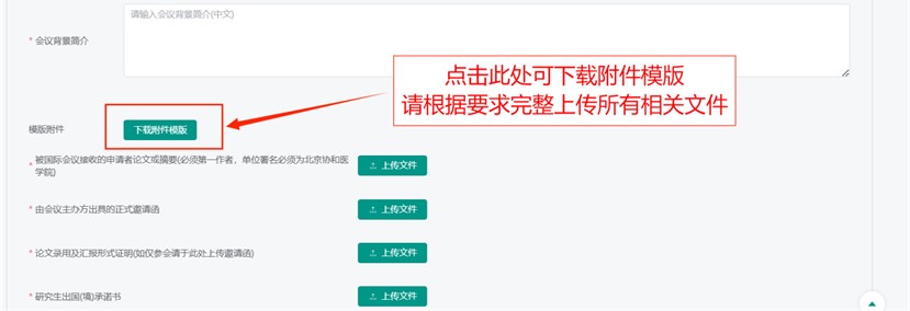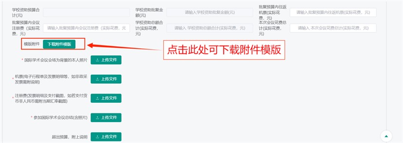 申请人需在会议结束后及时填写“总结报告”流程,并按照要求上传机票、注册费支付凭证、会议总结(含照片)、《总结报告表》及其他相关材料。模板可在流程表单中点击下载。